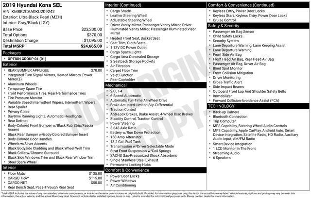 Ultra Black Pearl 2019 Hyundai Kona SEL 4D Sport Utility AWD 6-Speed Automatic with Shiftronic I4 25/30 City/Highway MPG